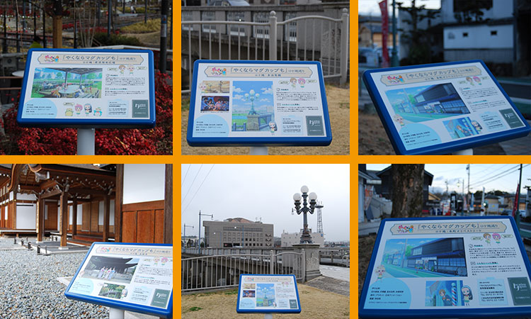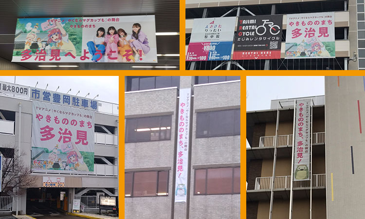 アニメの舞台や実写のロケ地マップを配布、実際に作中で登場したスポットが一目でわかる看板の設置、さらに街のいたる場所に横断幕や懸垂幕、さらに、多治見市の公用車がキャラクターをあしらったラッピングカー仕様に!また、ARアプリによる音声ガイドで、姫乃たちが多治見市と『やくならマグカップも』の世界観をご紹介!4月からの放送に向けて多治見市が『やくならマグカップも』一色に染まります!!