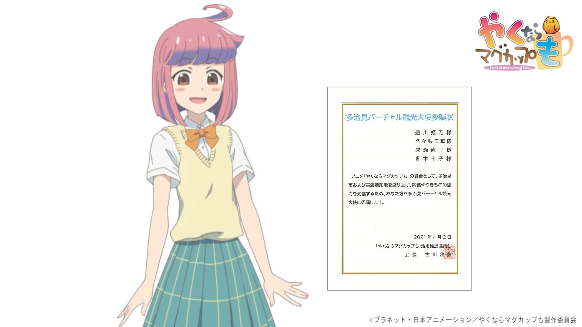 みなさん、こんにちは!TVアニメ『やくならマグカップも』の豊川姫乃です。この度は「やくならマグカップも」活用推進協議会から、「多治見バーチャル観光大使」に任命をいただきました。古川会長、ありがとうございます!