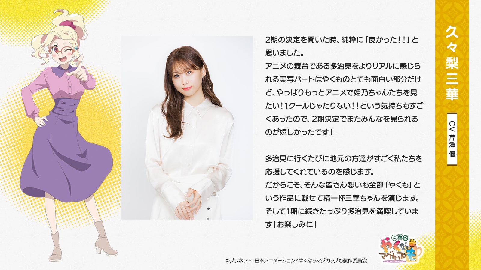 豊川姫乃役の田中美海、久々梨三華役の芹澤優、成瀬直子役の若井友希、青木十子役の本泉莉奈からコメントが到着しました!