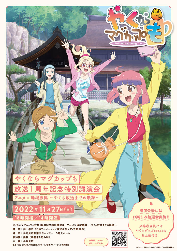 テレビアニメ「やくならマグカップも」の放送1周年を記念して物語の舞台、多治見市で講演会を実施いたします。本講演では講師に本作の製作に深くかかわった日本アニメーションメディア部の井上孝史 が「やくならマグカップも」をテレビアニメ化した経緯や多治見市との取り組みなど製作秘話をお話します。