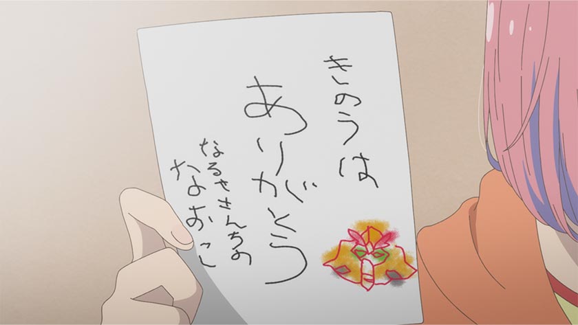 第2話 「私のパラダイス」 部屋の片付け中、幼い頃に直子から受け取った年賀状を発見した姫乃。直子本人に年賀状に書かれたメッセージの真意を教えてもらおうとするも、なぜか季節外れの桔梗の花を探しに行くことになり……? 脚本:荒川稔久 絵コンテ:神谷 純 演出:前田薫平 作画監督:吉岡彩乃、中野友貴